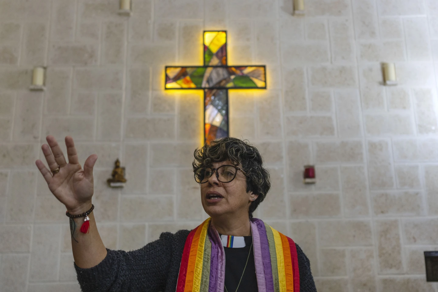 “The sky was our ceiling and when it rained, we’d all pack into a small room,” Saralegui said. In 2015, with support from the U.S.-based LGBTQ+ affirming Metropolitan Community Churches, they converted a house into their church, decked with wooden pews and a stained-glass cross that hangs above the altar. Underneath, a local Tibetan Buddhist group that meets here during the week stores its musical instruments in an example of interfaith partnership.